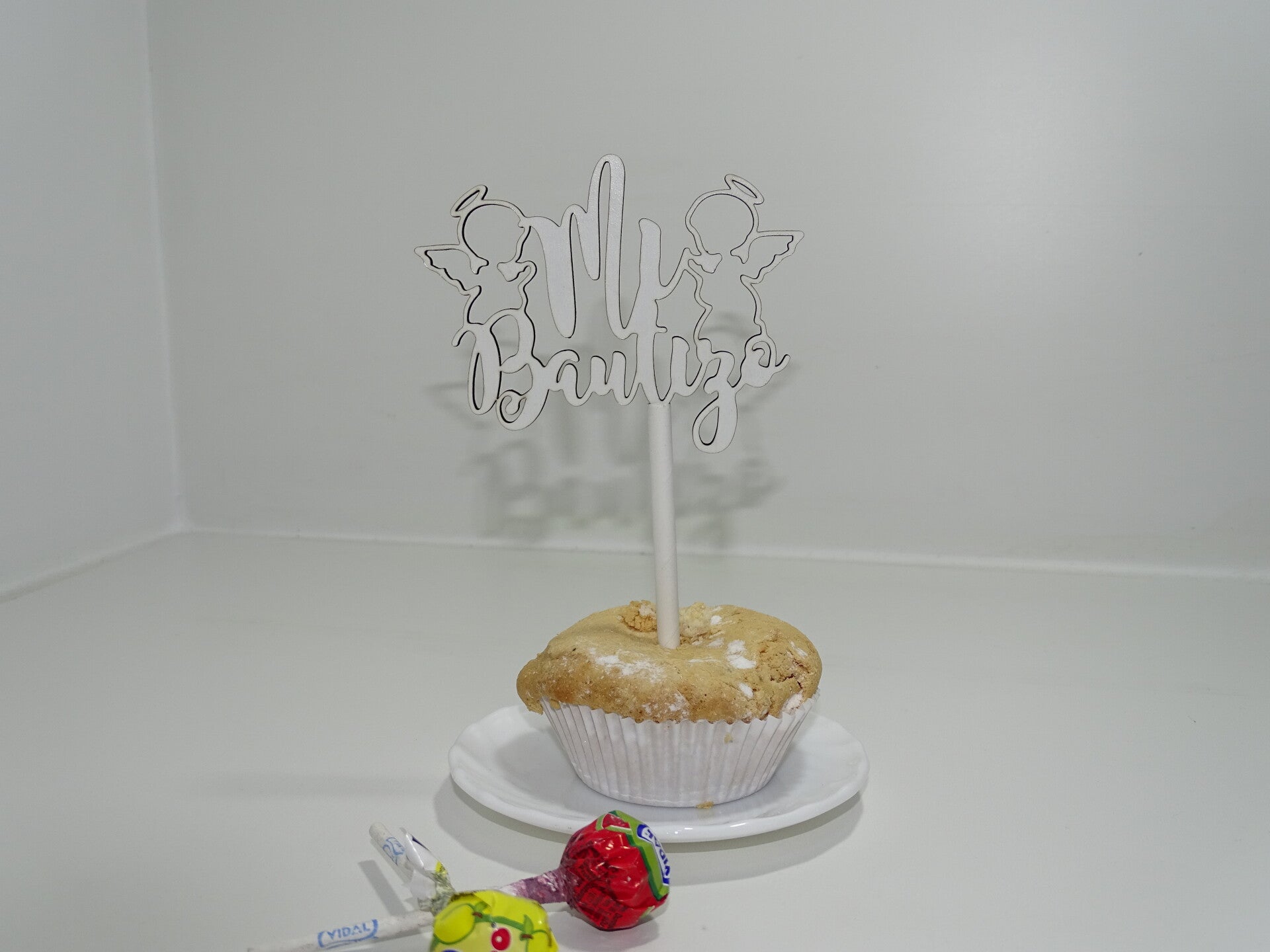 Sorprende a tus familiares con un Cake Topper de madera de 3mm de grosor con las letras Mi Bautizo.