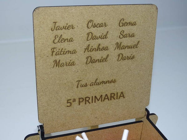 En la parte exterior va grabado el nombre del profesor/a, y en la parte interior al abrir la tapa viene grabado el nombre de los alumnos que le realizan el regalo.